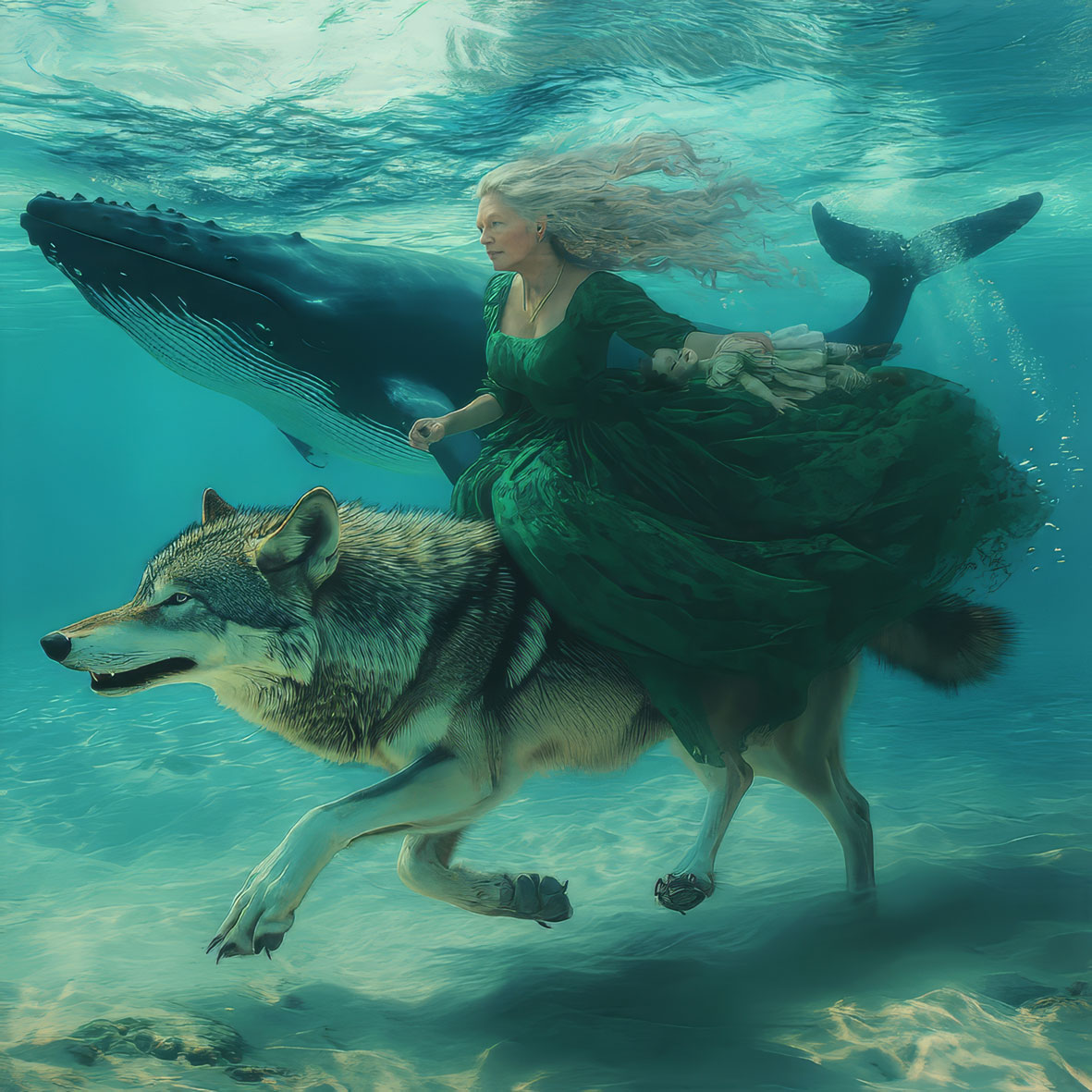 Digitale Collage: Eine Frau in einem fließenden grünen Kleid reitet unter Wasser auf einem Wolf, ihr Haar treibt wie Algen im Strom.
